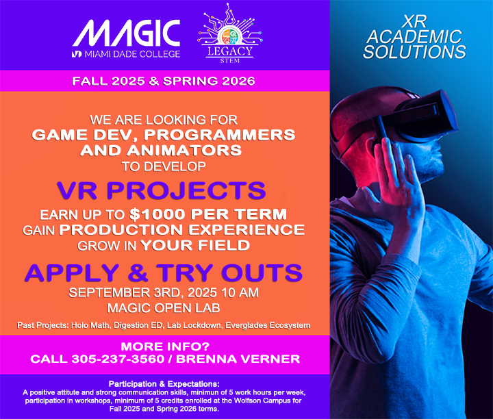 The MAGIC department and the STEM Legacy Grant are looking for talented programmers, game developers and animators to work on a Virtual Reality Project during the Fall 2025 and Spring 2026 terms. Students will be paired with disciplines to create virtual and agumented reality simulations for education.